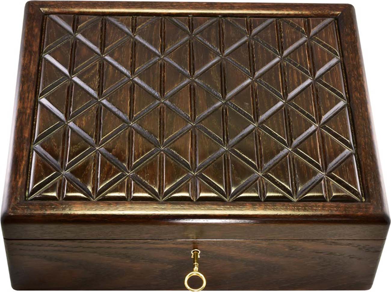 6500г. Корпус собран из дуба, крышка украшена резьбой, покрыт шилаком. На 8 планшетках, выполненных из махагона (красное дерево) можно разместить коллекцию из 206 монет (80 - диаметром 50 мм, 126 - диаметром 30 мм). Каждый из ложементов имеет суконную подложку и сквозное отверстие, что даёт возможность монетам “дышать” и покрываться благородной кабинетной патиной. Вместимость: 206 монет. Размер: 352х285х125 мм. Вес: 6,5 кг.