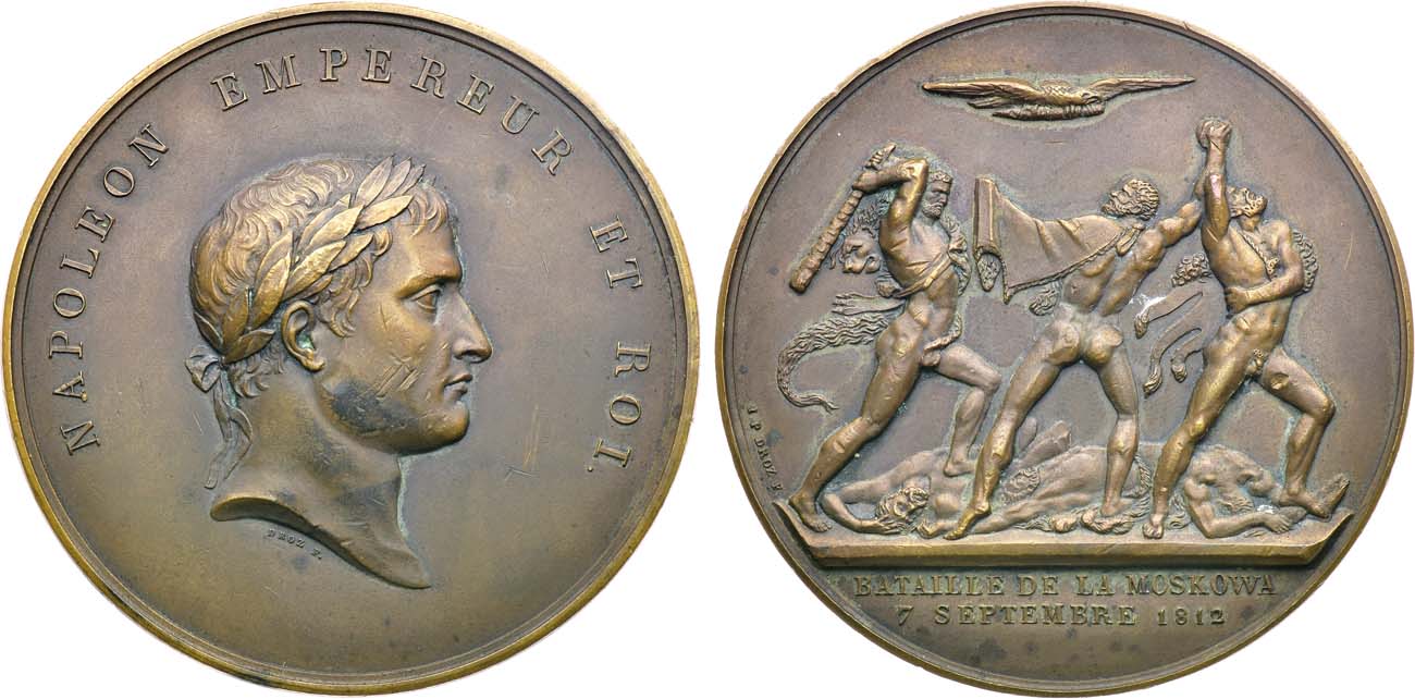 Надпись на реверсе медали: «BATAILLE DE LA MOSKOWA / 7 SEPTEMBRE 1812 / M•DCCCXII.» (Битва под Москвой 7 сентября 1812 г.).