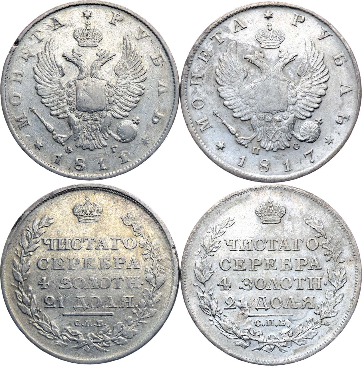 Серебро. 1 рубль 1811 г. СПБ-ФГ. 20,76 г. Уздеников 1396. Биткин 99 (R). XF. 1 рубль 1817 г. СПБ-ПС. 20,23 г. Аверс: орёл образца 1810 года. Уздеников 1440. Биткин 116. Равномерный штемпельный блеск. Следы лёгкой коррозии. AU.