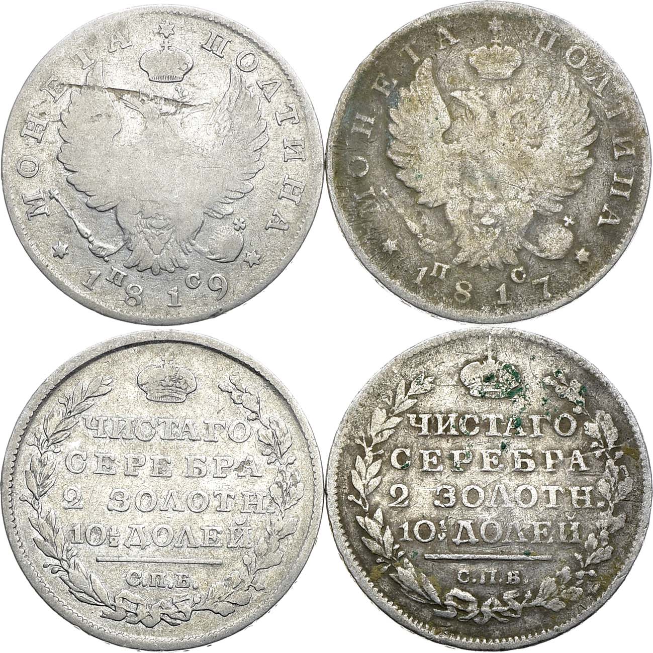 Серебро. 1. Полтина 1817г. СПБ-ПС. Серебро, 10,11 г. G. 2. Полтина 1819г. СПБ-ПС. Серебро, 9,89 г. G.