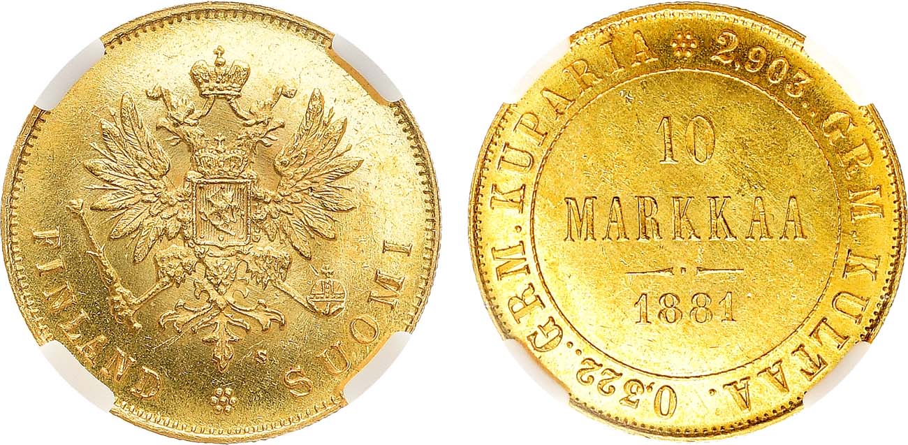 Золото. Для Финляндии. Гельсингфорсский монетный двор. Уздеников 4718(–). Биткин 228. MS 63.