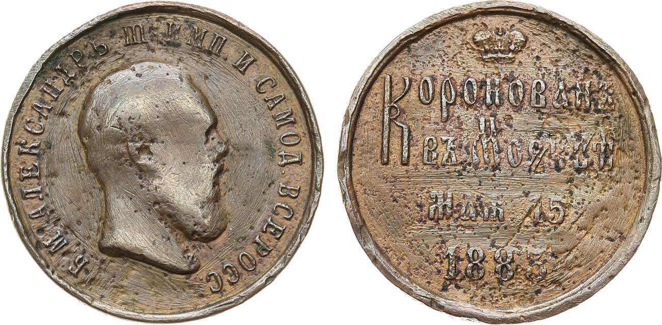 Темная бронза. 13,84г. Диаметр 29,5 мм. Санкт-Петербургский монетный двор, 1883-1884 гг. Медальеры: аверс — Л.Х. Штейнман (подпись утрачена), реверс — М.Я. Габе (без подписи). Биткин 1075. Смирнов 886. Дьяков 932.1 (R0). G.