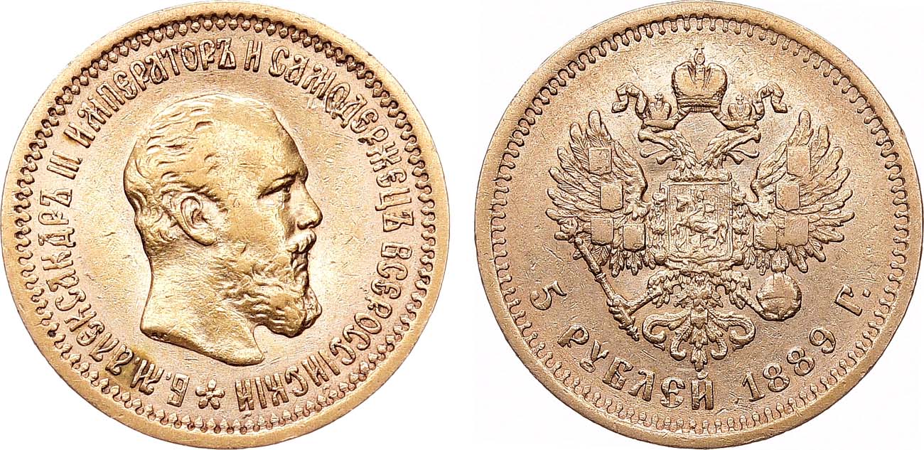 Более редкая на практике разновидность 5-ти рублей 1889 года с буквами "АГ" в обрезе шеи