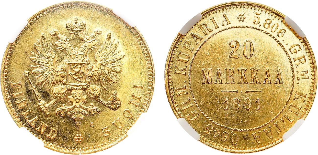 Золото. Для Финляндии. Гельсингфорсский монетный двор. Уздеников 4734(–). Биткин 227(R). Казаков 752(R1). MS 61.