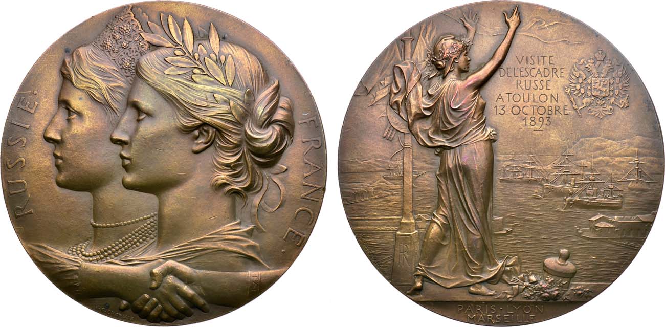 Бронза. 182,78г. Диаметр 70,5 мм. Франция, Парижский монетный двор. Медальер Ж.-К.Шаплен (аверс — внизу на поле: "J.C.CHAPLAIN", реверс — слева внизу на поле: "J.C.CHAPLAIN"). Клейма на гурте внизу: Парижского монетного двора (рог изобилия) и «BRONZE». Дьяков 1087.1. UNC.
