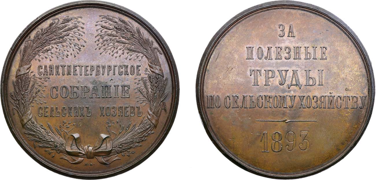 Бронза. 125,59г. Диаметр 65 мм. Санкт-Петербургский монетный двор. Медальер Н.А.Козин (внизу на поле: "Н.К."). На реверсе медали две последние цифры года: [18]«93» выбиты пуансонами дополнительно. Смирнов 677. Дьяков 691.1(R0). AU/UNC.
