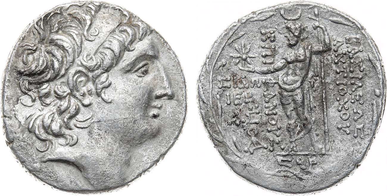 Серебро. 16,15г. г. Сидон. Аверс: голова Антиоха VIII в диадеме вправо. Реверс: "BAΣIΛEΩΣ / ANTIOXOY — EΠIΦANOYΣ" Зевс анфас, голова влево, в правой руке он держит звезду, а в левой — длинный скипетр; над ним — полумесяц; всё изображение в лавровом венке. XF/AU.