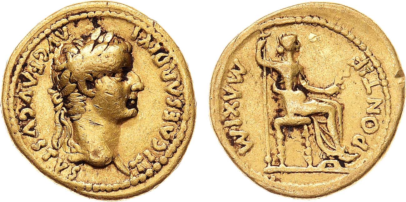 Золото. 7,64г. Лугдун (Лион). Аверс: круговая легенда "TI CAESAR DIVI AVG F AVGVSTVS"; портрет императора в лавровом венке - вправо. Реверс: круговая легенда "PONTIF MAXIM". Sear 1760. RIC 25. VF.