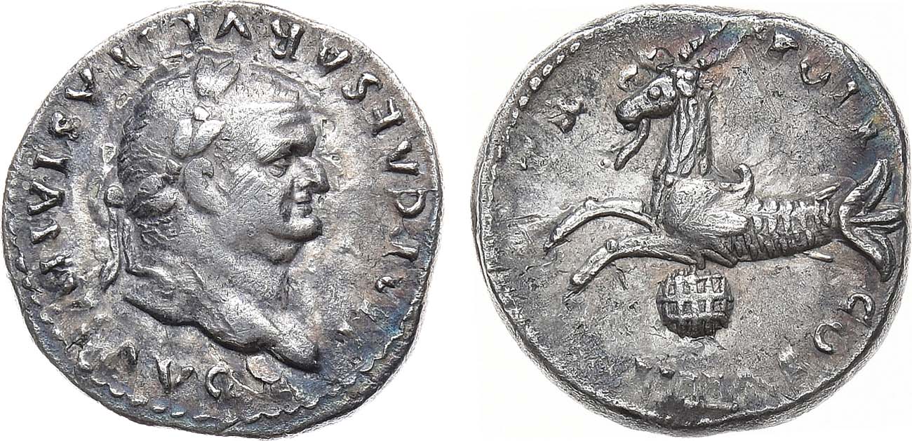 Серебро. 2,92г. Рим. Аверс: "IMP TITVS CAES VESPASIAN AVG P M" бюст императора в лавровом венке вправо. Реверс: "TR P VIIII IMP XIIII-C-OS VII P P" Козерог, летящий влево, глобус внизу. XF.