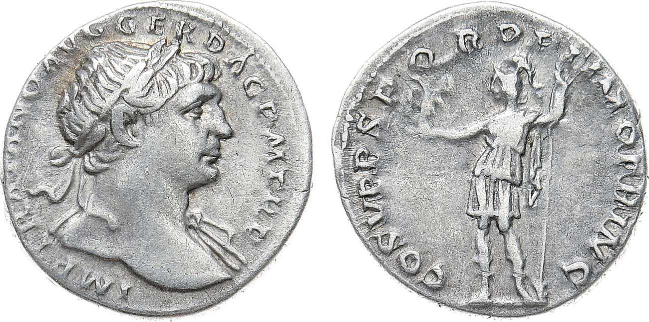 Серебро. 3,23г. Рим. Аверс: "IMP TRAIANO AVG GER DAC P M TR P" драпированный бюст Траяна в лавровом венке вправо. Реверс: "COS V P P S P Q R OPTIMO PRINC" Рим влево, на правой руке — Ника, в левой — копьё. BMC 271. Cohen 68. RIC 115. RSC 68a. XF.
