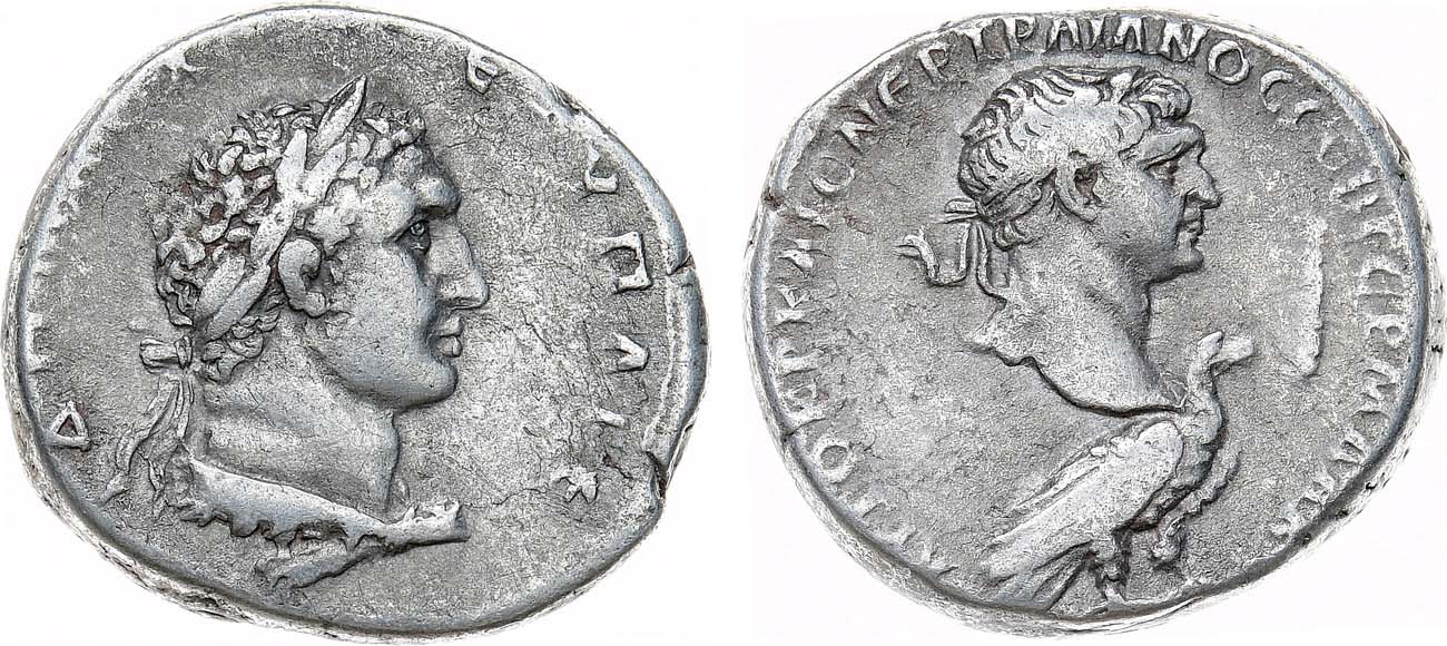 Серебро. 14,42г. Аверс: бюст Траяна в лавровом венке вправо, под ним орёл, справа дубинка; легенда "ΑΥΤΟΚΡ ΚΑΙϹ ΝEΡ ΤΡΑΙΑΝΟϹ ϹEΒ ΓEΡΜ ΔΑΚ". Реверс: голова Мелькарта в лавровом венке вправо, с завязанной на шее львиной шкуре; легенда "ΔΗΜΑΡΧ EΞ ΥΠΑΤ E". VF.