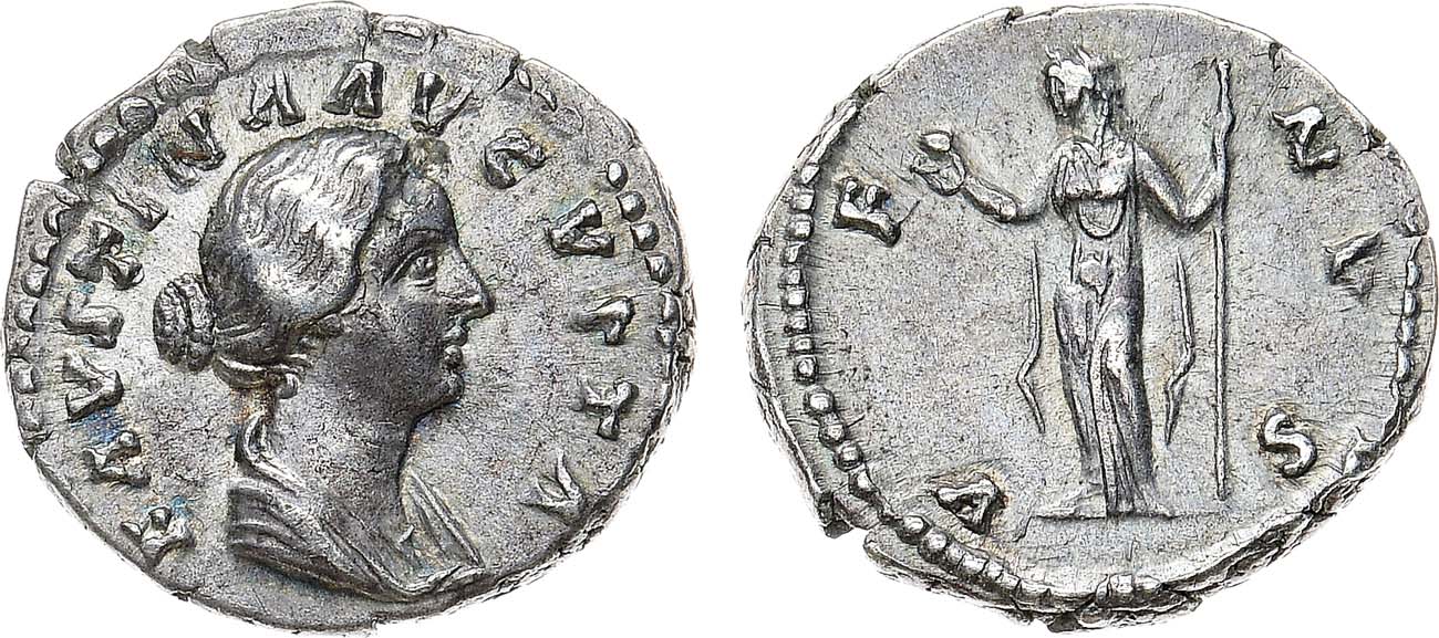 Серебро. 2,94г. Рим. Аверс: "FAVSTINA AVGVSTA" бюст Фаустины вправо. Реверс: "VENVS" богиня Венера влево, держит в руках скипетр и голубя. Sear 5266. RIC 730. AU.