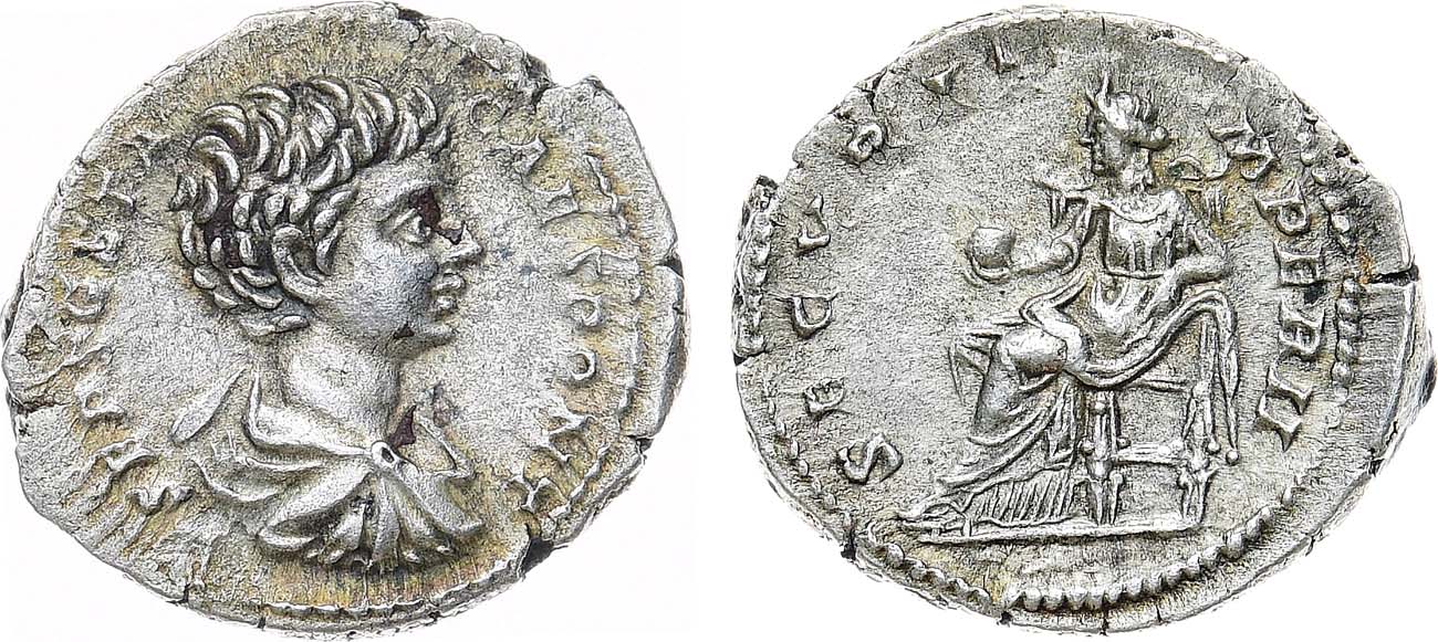 Серебро. 3,15г. Рим. Аверс: "P SEPT GETA CAES PONT" драпированный бюст императора вправо. Реверс: "SECVRIT IMPER II" Статуя Рима на троне влево. Sear 7200. RIC 20. XF/AU.