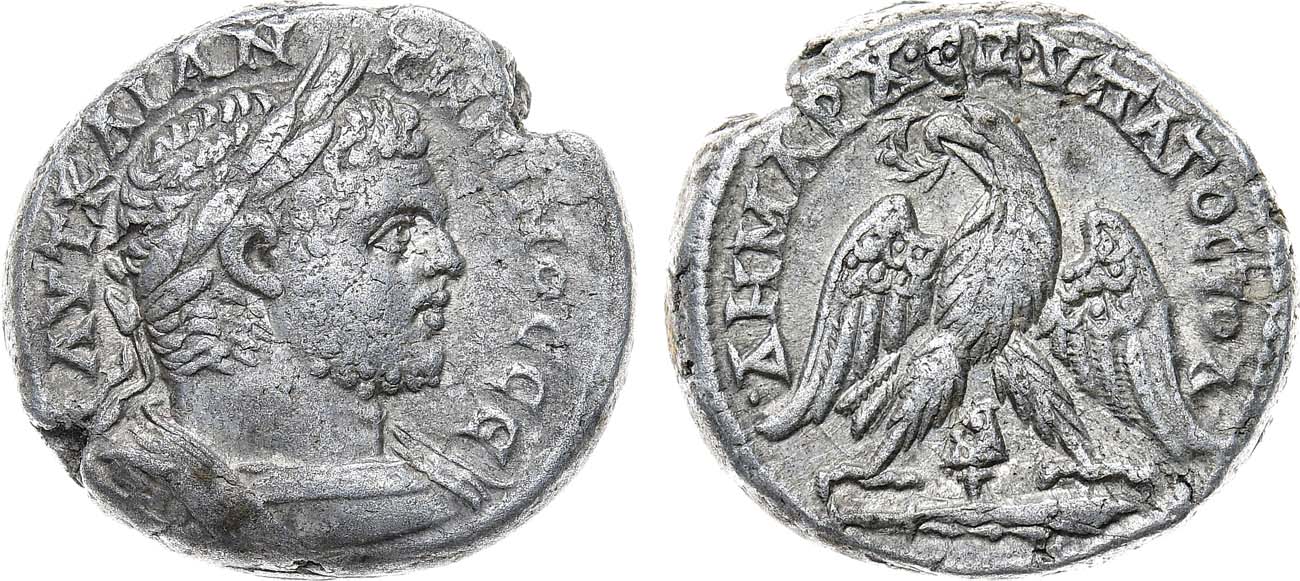 Серебро. 14,62г. Монетный двор г.Тир. Аверс: "AVT KAI ANTωNINOC CЄ" драпированный бюст императора в лавровом венке вправо. Реверс: "ΔHM APX • ЄΞ YΠATO TO • Γ •" орёл, стоящий на палице вправо, голова и хвост влево, с расправленными крыльями, с венком в клюве; между лапами раковина мурекcа. VF.