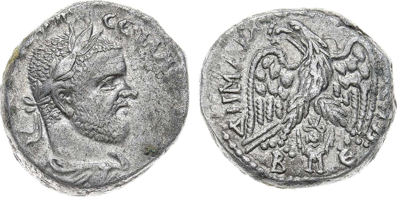 Серебро. 12,95г. Монетный двор г. Бероя. Аверс: драпированный бюст императора в лавровом венке. Реверс: "DHMARX EX [YPATOC] D", "B-E" слева и справа внизу; Орёл с раскрытыми крыльями анфас, фантастическая птица между лап. Prieur 893. VF/XF.