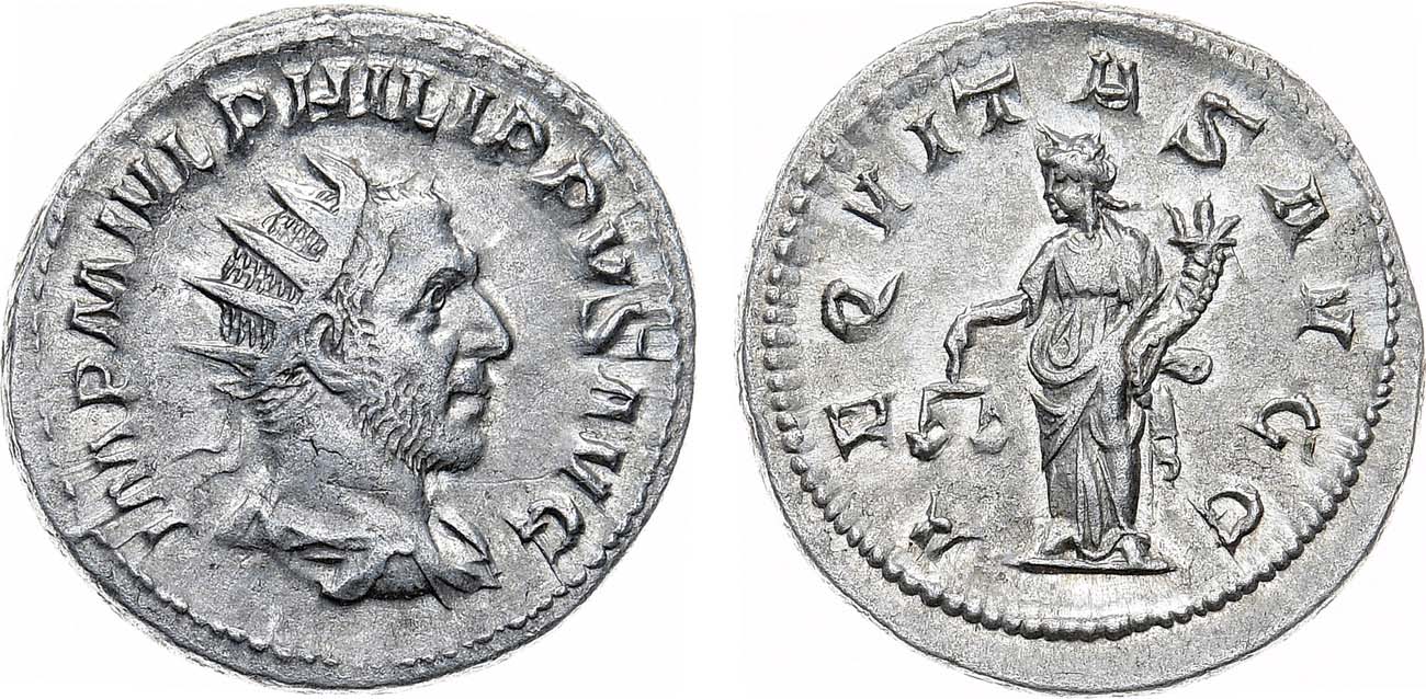 Серебро. 4,36г. Рим. Аверс: "IMP M IVL PHILIPPVS AVG" драпированный бюст императора в лучистой короне вправо. Реверс: "AEQVITAS AVGG" Богиня Справедливость анфас, голова влево; в руках рог изобилия и весы правосудия. Sear 8918. RIC 27b. Hunter 25.. AU.