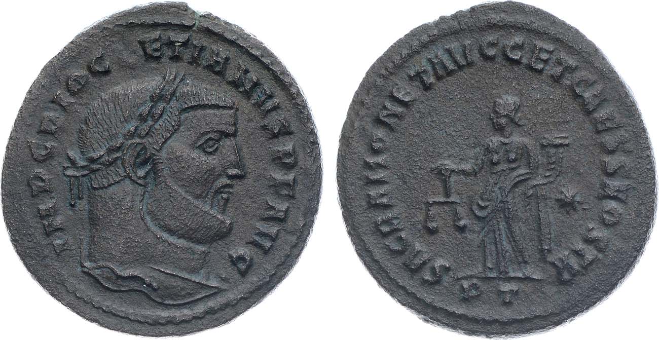 Бронза. 8,88г. Тицин. Аверс: "IMP C DIOCLETIANVS P F AVG" драпированный бюст императора в диадеме вправо. Реверс: "SACRA MONET AVGG ET GAESS NOSTR". Без точки. Sear 12822. VF/XF.