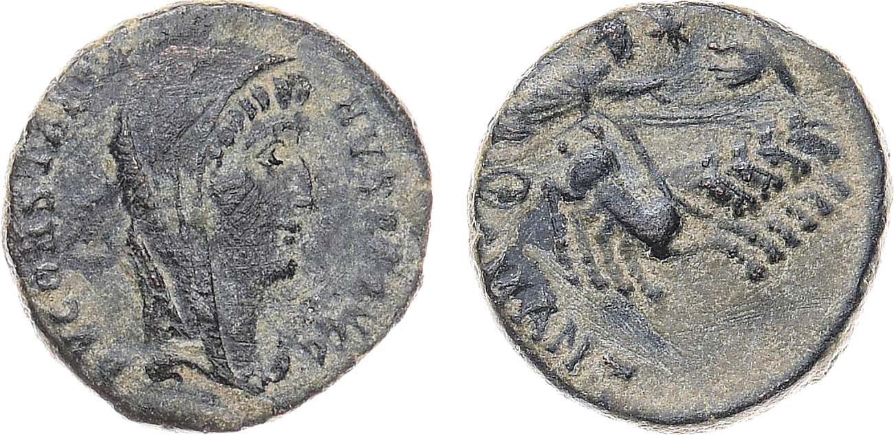 Император Константин I Великий умер 22 мая 337 года. После его смерти на территориях, управляемых его двумя старшими сыновьями Константином II и Констанцием II, был предпринят выпуск памятных монет, на которых почивший Император изображался как "божественный Константин" ("Divus Constantinus"). Языческая практика причисления умершего правителя к богам, казалось бы, стала неуместной в свете крещения Константина и христианизации Империи. В действительности, это был последний отголосок прекращавшейся старой традиции. Младший сын Константина, Констант I, наиболее последовательный христианин из новых императоров (был единственным из братьев, кто принял крещение в 337 году), уже не следовал старой практике обожествления умершего императора и не выпускал на подконтрольных ему монетных дворах монет с подобным сюжетом. Примечательно, что несмотря на языческий подтекст представленной монеты (где иконография реверса напрямую перекликается с иконографией бога Гелиоса, движущегося по небу на своей колеснице, запряжённой четвёркой лошадей), изображение является в то же время прототипом иконографии библейского сюжета огненного восхождения святого пророка Илии на небо (книга Царств, IV. 2: 1-14).