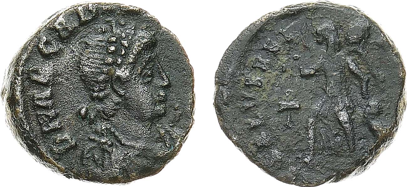 Бронза. 1,33г. Константинополь. Аверс: бюст Аркадия в жемчужной диадеме вправо. Реверс: Виктория несёт трофей на плече и держит пленника левой рукой, слева в поле хризма. VF.