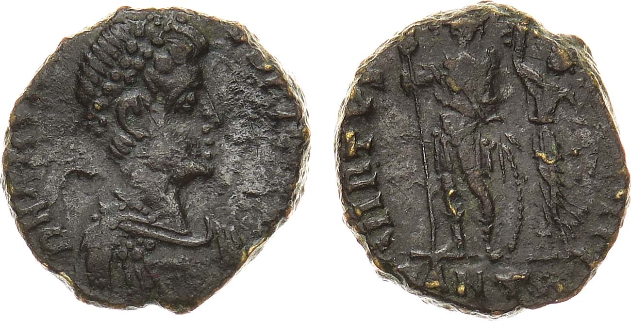 Бронза. 2,26г. Антиохия. Аверс: бюст императора в диадеме вправо; легенда "D N HONORI-VS P F AVG". Реверс: фигура стоящего анфас Гонория, держащего копье и опирающегося на щит; справа от него Виктория, с пальмовой ветвью и венком в руках. XF.