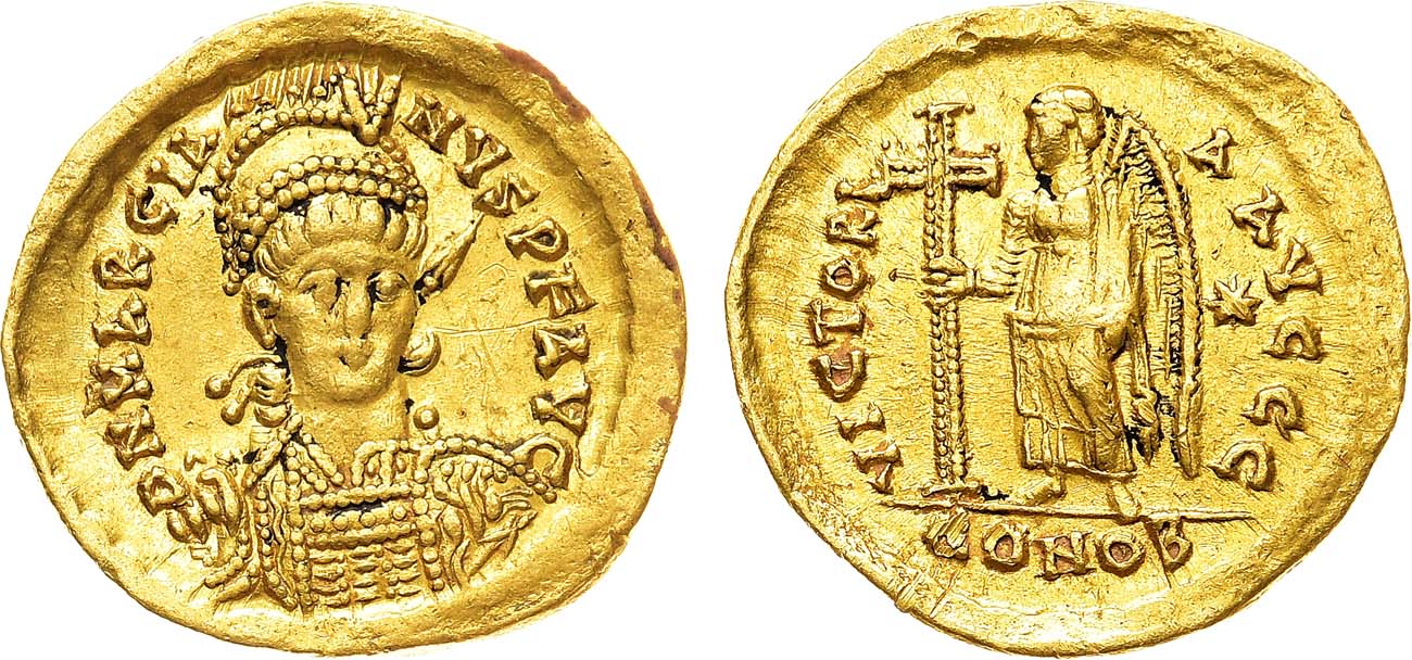 Золото. 4,15г. Константинополь. Аверс: "DN MARCIANYS PF AVG" императора в военных доспехах с копьём и щитом. Реверс: "VICTORIA AVGGG" Богиня Виктория влево, в правой руке большой крест, слева в поле звезда; внизу под линией обреза "CONOB". Sear 21379. XF.