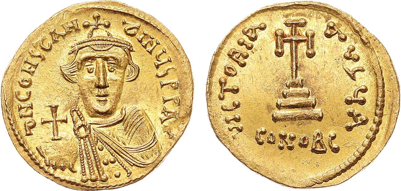 Золото. 4,46г. Константинополь. Аверс: круговая легенда "DN CONSTAN-TINЧS PP AVG"; портрет императора анфас с державой в правой руке. Реверс: круговая легенда "VICTORIA-AVГЧ A"; изображение Креста на трёх ступенях; внизу "CONOBC". Sear 939. Sommer 12.4. UNC.