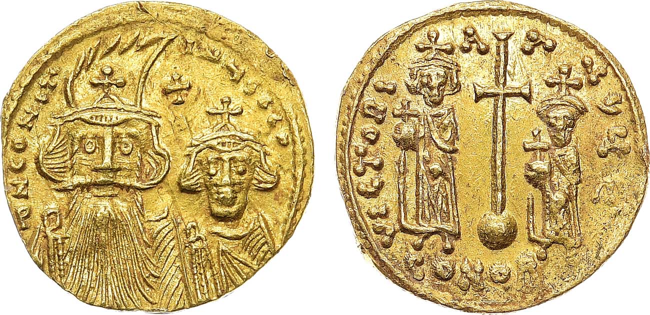 Золото. 4,43г. Константинополь. Аверс: круговая легенда "DN CONS-TANI"; портрет Константина с длинной бородой слева и Константина IV-младшего правителя, справа. Изображение креста на поле. Реверс: круговая легенда "VICTORI-A-AVГЧ"; ростовые изображения Ираклия и Тиберия и державы между ними. Sommer 12.21, Sear 962. AU/UNC.