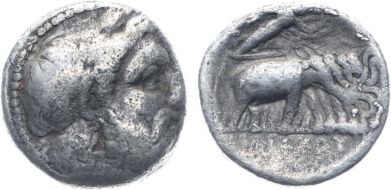 Серебро. 3,53г. Аверс: голова Зевса с бородой и в ларовом венке вправо. Реверс: Афина, размахивающая копьем, держит слонов в квадриге; под линией обреза легенда "ΣΕΛΕΥΚΟΥ". VF.