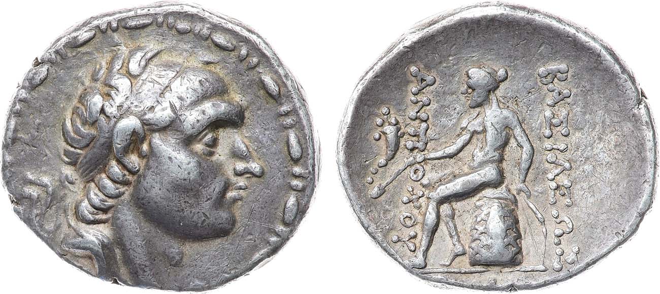 Серебро. 17,13г. Антиохия-на-Оронте. Аверс: изображение царя в диадеме вправо; в венке. Реверс: Аполлон сидит слева на омфале, держит стрелу и натянутый лук, слева — рог изобилия. VF/XF.
