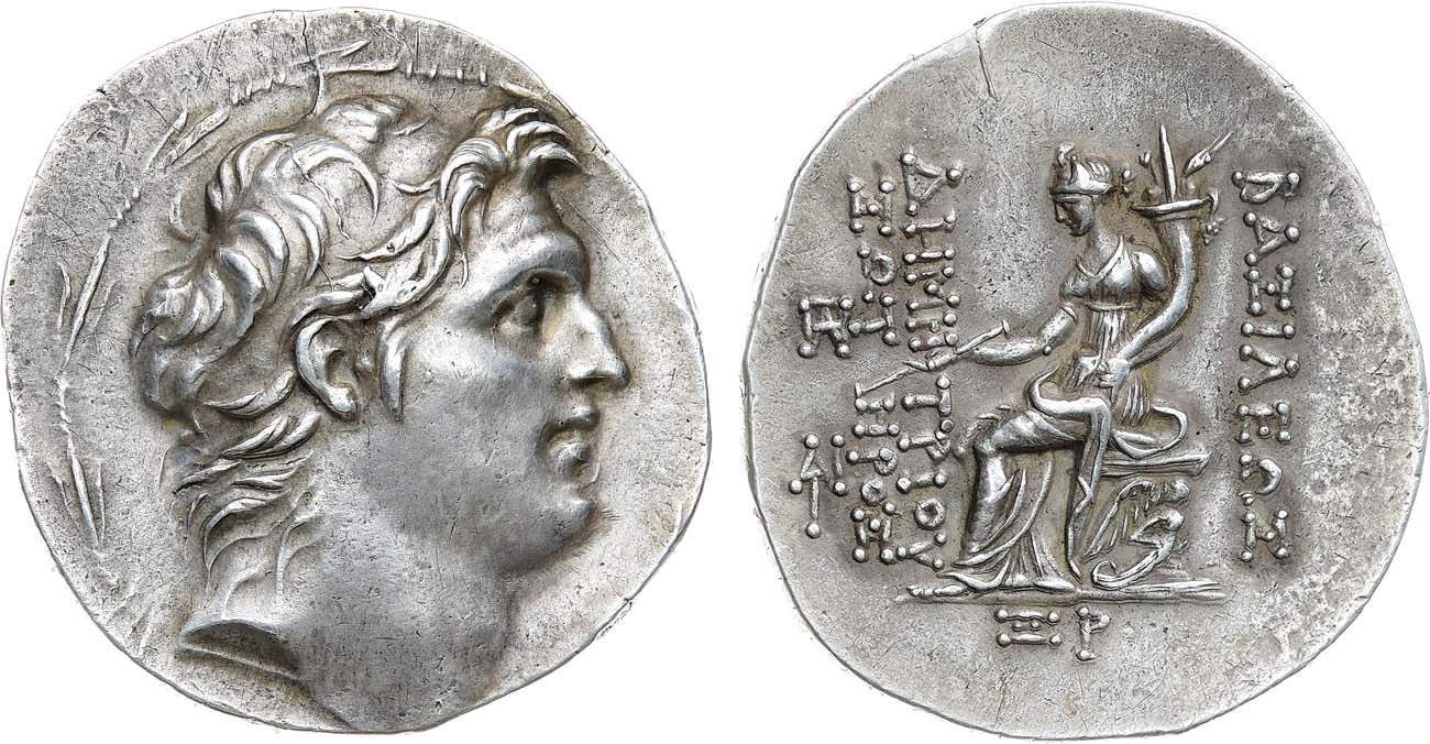 Серебро. 16,48г. Антиохия-на-Оронте. Аверс: голова Деметрия в диадеме вправо в венке. Реверс: "ΒΑΣΙΛΕΩΣ - ΔHMHTPIOY / ΣΩT HPOΣ" Тихе, сидящая на троне влево; ножка трона в виде крылатого чудовища; в правой руке держит скипетр, в левой рог изобилия; монограмма в нижней части "XР". XF.