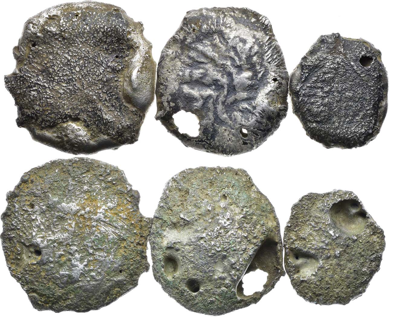 Платежный слиток "закамского" серебра. Серебро, 88,4 г. Состав: серебро (59÷85%), медь (5÷8%), свинец и золото. Размер: 47,89х43,20 мм. Высота: 9,93 мм. Толщина у края: 1,93÷4,12 мм. Вблизи краев на верхней стороне слитка имеются: одна маленькая усадочная пора и 2 сквозных следа от пор. Нижняя сторона слитка обладает более бугристой поверхностью, на ней также имеется несколько крупных усадочных раковин, из них две сквозные. Боковая поверхность слитка сглажена. Платежный слиток "закамского" серебра. Серебро, 74,64 г. Состав: серебро (40÷64%), медь (6÷16%), свинец и золото и железо. Размер: 49,55х48,66 мм. Высота: 5,80 мм. Толщина у края: 2,58÷4,34 мм. Верхняя сторона слитка на значительной площади - темная с выступающими сглаженными светлыми точками; по краям имеются наплески светлого металла, на границе с которыми видно несколько мелких усадочных раковин. Нижняя сторона слитка еще более темная, с пятнами коричневого цвета - с бугристой поверхностью и одной заметной усадочной раковиной. У одного из боков слитка видны нанесённые в древности царапины. Платежный слиток "закамского" серебра. Серебро, 34,19 г. Состав: серебро (40÷63%), медь (4÷16%), свинец и золото. Размер: 37,40х32,35 мм. Высота: 6,23 мм. Толщина у края: 1,94÷3,57 мм. Верхняя сторона слитка - плоская, гладкая, практически не имеет усадочных пор, толька на расстоянии 5 мм от правого края слитка имеется круглая усадочная пора. Нижняя плоскость более светлая, обладает шершавой поверхностью. На ее краях имеются две большие поры с гладкими стенками, образовавшиеся от пузырьков воздуха; на дне каждой из них есть пара небольших усадочных пор. По своему составу эти слитки соответствуют низкопробным слиткам "закамского" серебра, источником для которых были руды серебросвинцовых месторождений. Изготовлены в XI-XII вв. На каждый слиток имеется экспертное заключение Н.С. Моисеенко.