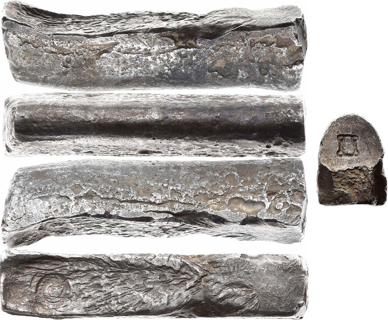 Серебро. 94,88г. Длина: 62,2 мм; ширина: 13,3 мм, высота: 17,2 мм. На боковой поверхности имеются небольшие усадочные углубления и следы от литья в два приёма. Края сглажены, прокованы. На верхнюю плоскость слитка нанесено клеймо: голова человека с косами в неполном точечном ободке. На торцевую сторону слитка нанесено клеймо: голова человека с четырьмя точками. Прокопов 147-148, клейма 109, Т32. AU.