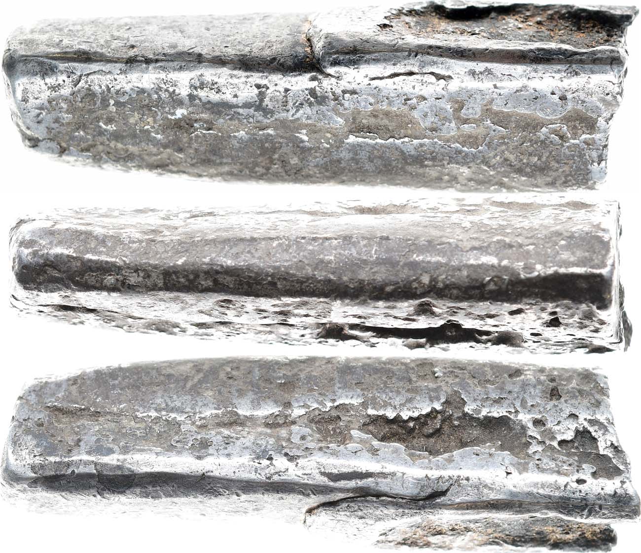 Серебро. 96,06г. Длина: 59 мм; ширина 15 мм. Высота: 18 мм. На боковой поверхности имеются небольшие усадочные углубления и следы от литья в два приёма. Края сглажены, прокованы. Граффити на торцевой стороне слитка. Изготовлена в XIV в. Прокопов 42-48. AU.