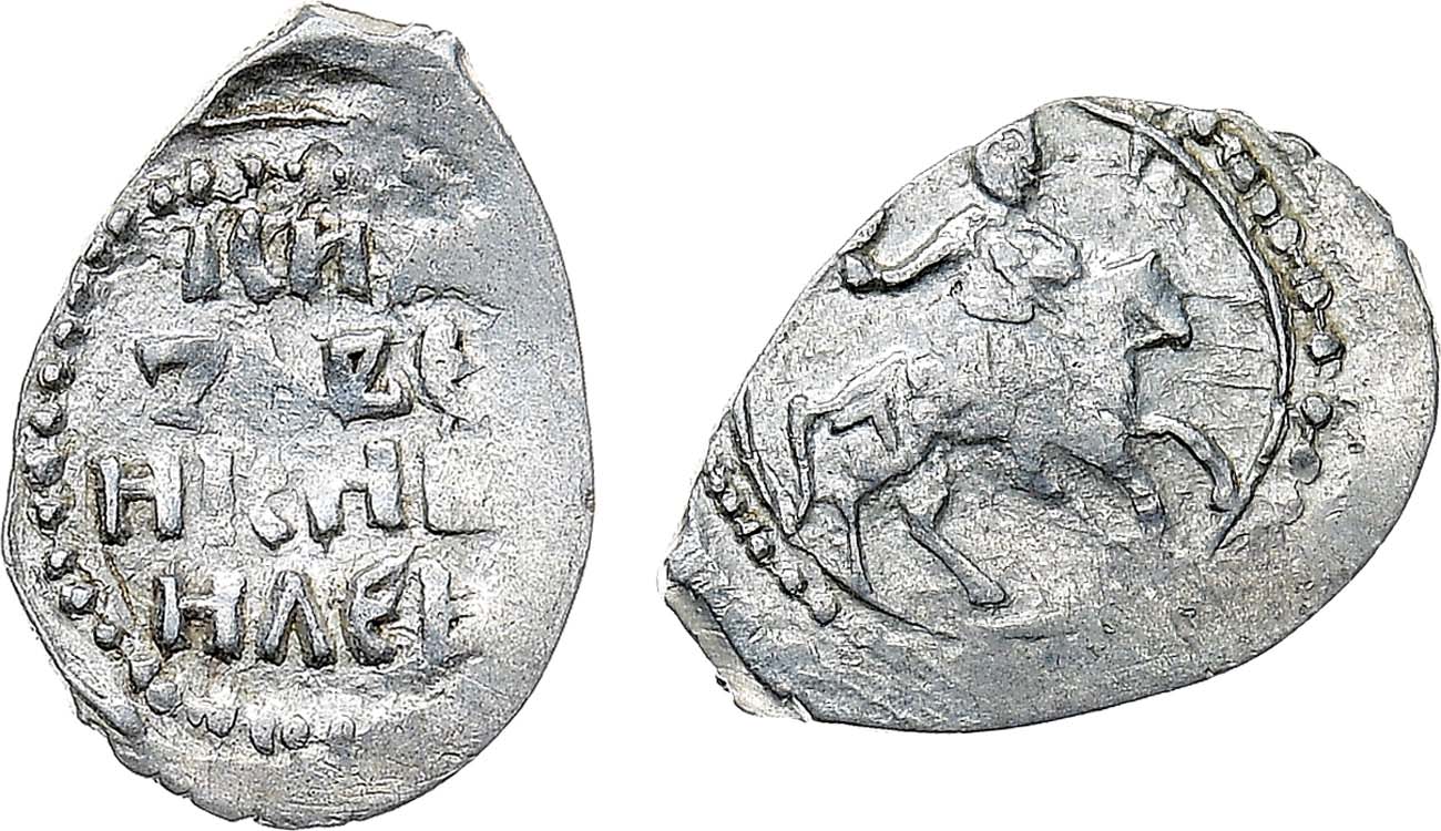 Серебро. 0,73г. Чеканка в Москве. Аверс: строчная легенда. Реверс: сокольник на лошади вправо; линейный и точечный ободок. ГП2 1510D (R-III). AU/UNC.