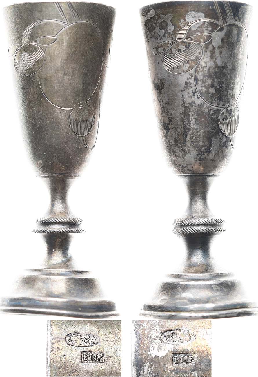 Насыщенная тёмная патина. Замятости оснований обеих рюмок.