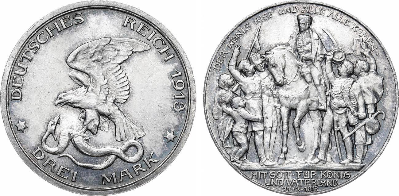 Серебро. 16,66г. Берлин (без обозначения). Отчеканена в память освободительной войны против Наполеона. KM 534. Jaeger 110. Weege 110.. AU.