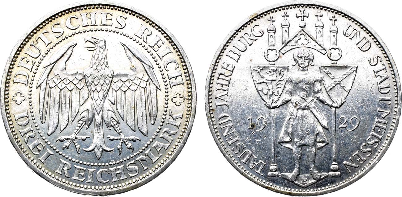 Серебро 500 пробы. 15,02г. Мюльденхюттен (Е). Отчеканена в память 1000-летия города Мейсен KM 65. Jaeger 338. Weege 39.. AU.