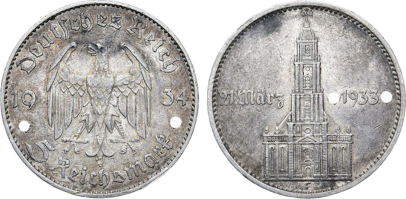 Серебро 900 проба. 13,8г. Штутгарт (F). Тираж 401000 экз. 1 год нацистскому режиму, Гарнизонная церковь в Потсдаме (21 März 1933). KM 82. Jaeger 357. XF.