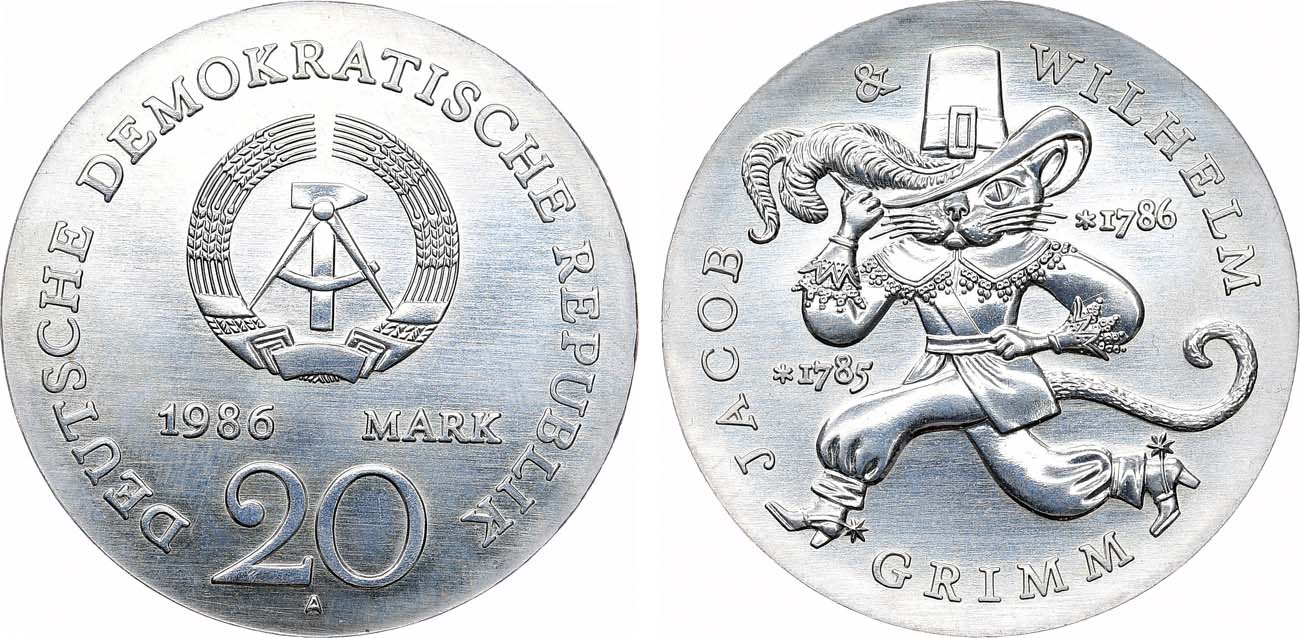 Серебро. 20,95г. Берлин (А). Отчеканена в память 200-летия Братьев Гримм (Кот в сапогах). Тираж 37.650 экз. KM 108. UNC.