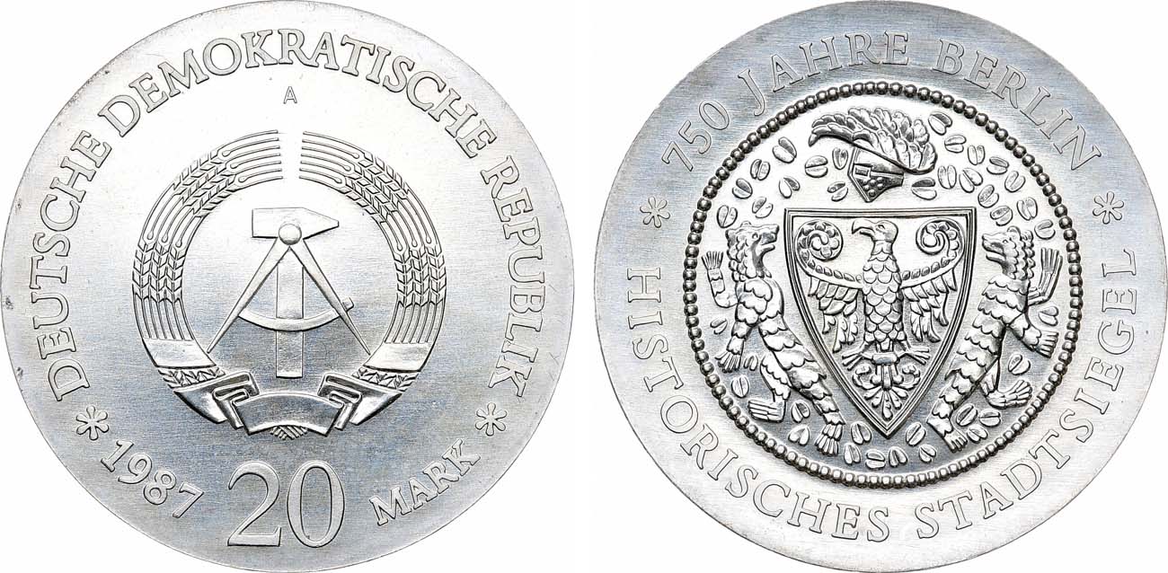 Серебро. 20,95г. Берлин (А). Отчеканена в память 750-летия Берлина. KM 119.1. Jaeger 1617. UNC.