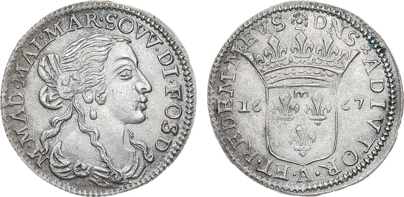 Серебро. 2,17г. Тассароло. Аверс: бюст вправо; легенда "M MAD MAL MAR SOVV DI FOSD". Реверс: дата разделена гербом; легенда "DNS ADVITOR ET REDEM MEVS". AU/UNC.