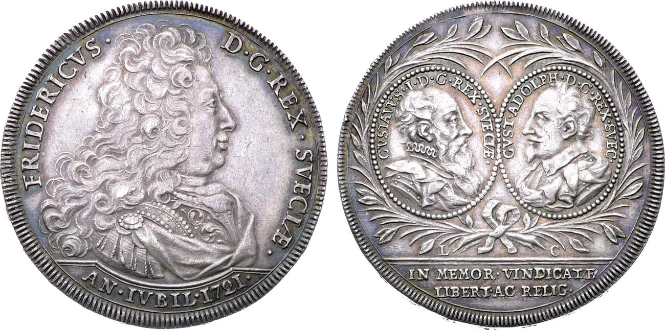 Серебро. 30,12г. Стокгольм. Отчеканена к 200-летию начала Реформации в Швеции. KM 389. Davenport 1719. AU.