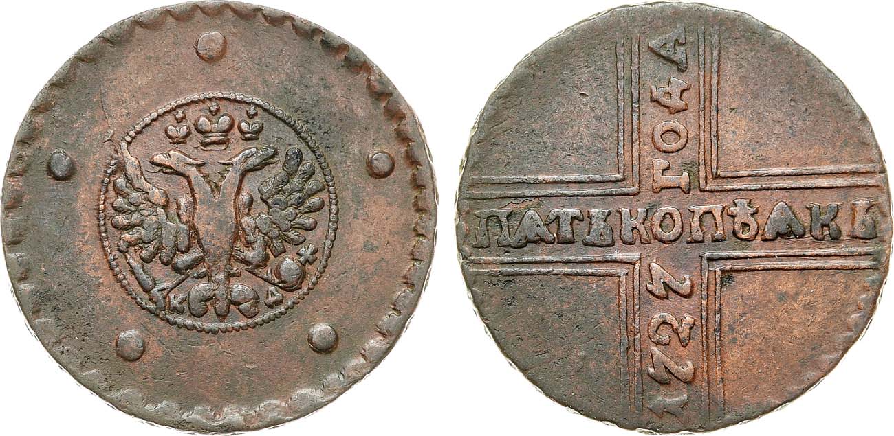 Медь. 15,59г. Красный монетный двор. Аверс: 5 перьев в хвосте орла. Реверс: "КОПѢѦКЪ". Уздеников 2463. Биткин 304. Дьяков 87, 43. Brekke 53, 30. AU 55.