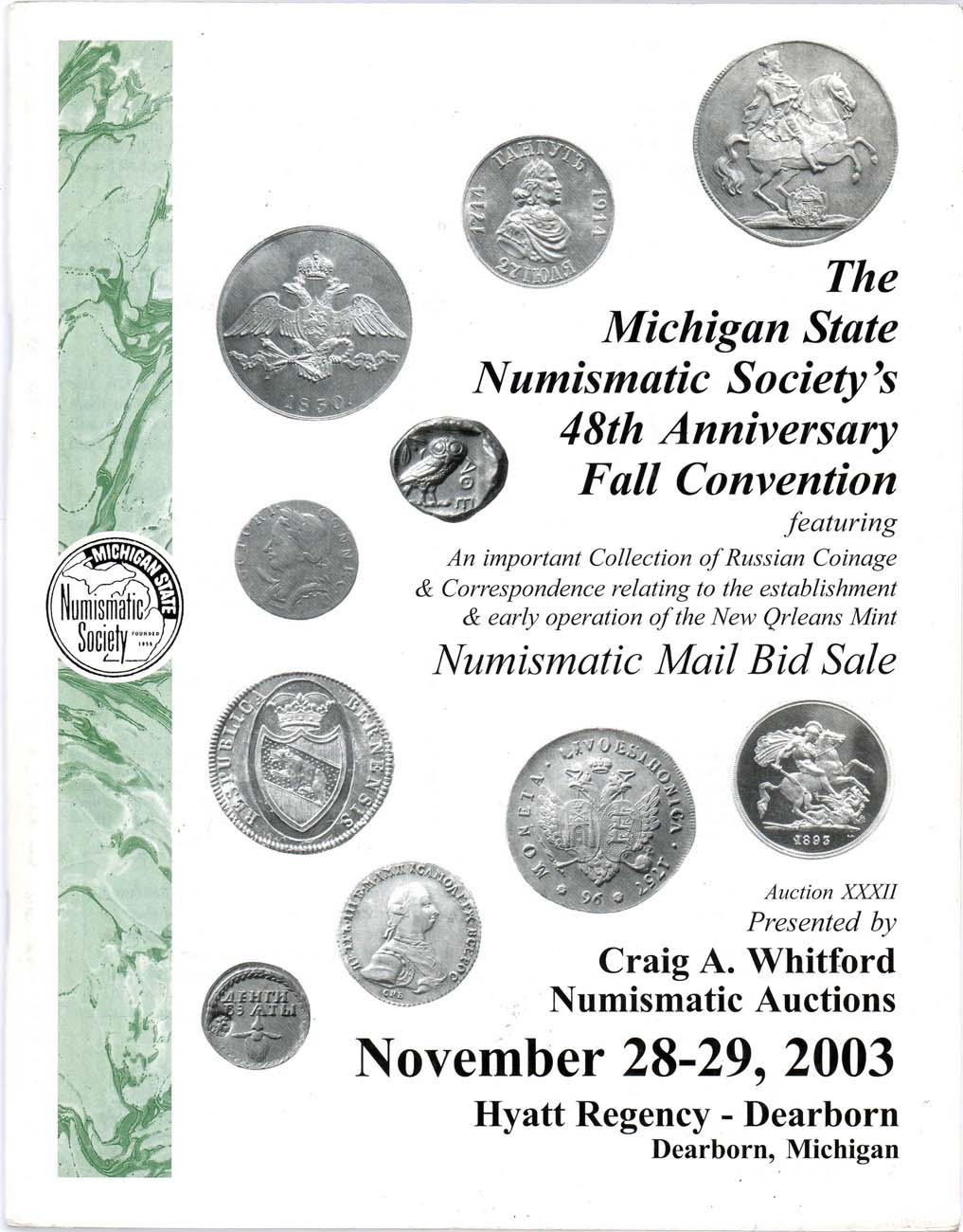 28-29 ноября, 2003 года. Дирборн (Мичиган). 1950 лотов. Нумизматическое общество штата Мичиган. Выдающаяся коллекция из 181 лота русских монет. Среди топ-лотов: новодел гроша 1727 и пробной копейки 1755, габаритный модуль рубля 1845, комплект пробных медных монет 1830 года. Много серебряных монет, в том числе в исполнении proof.