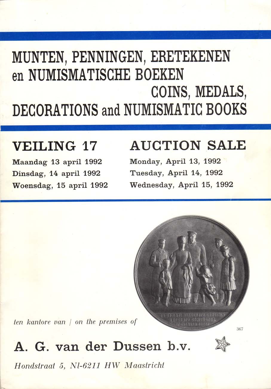 Маастрихт, 13-15 апреля 1992 года. 2000 лотов. Великолепная коллекция русских медалей, орденов, монет и нумизматической литературы. Распродажа большой русской коллекции орденов, настольных и наградных медалей и монет. Следует отметить большое количество рублей периода Петра I, а также рублей XVIII века, три "семейных" рубля 1835 и 1836 годов, включая крайне редкий без знака монетного гравера в обрезе портрета, рубли XIX века, в том числе в исполнении proof. Особое внимание заслуживает комплект русско-польских пробных монет 1, 2 и 5 злотых 1818 года.