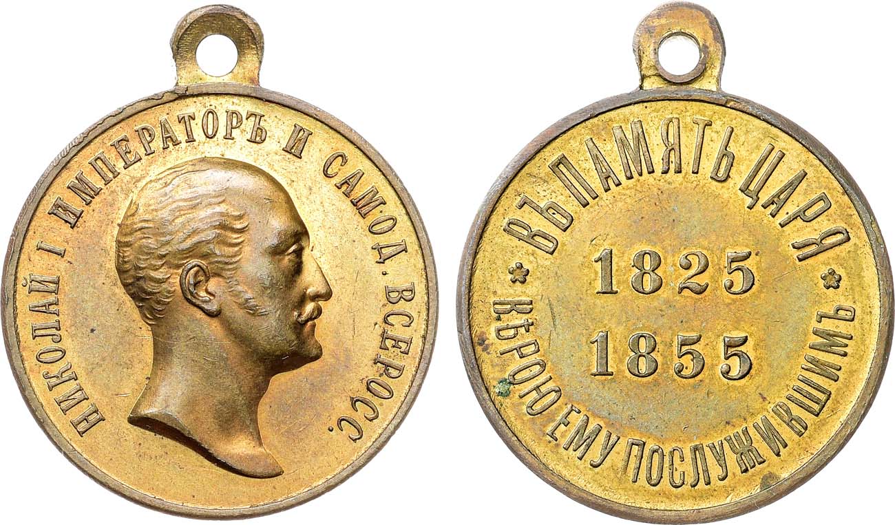 Учреждена повелением Императора Николая II, объявленным 30 апреля 1896 г. военным министром П.С.Ванновским. Светло-бронзовыми медалями награждали нижних чинов, состоявших в царствование Императора Николая I на действительной службе. С аукциона World-Wide Coins of California James F. Elmen, Санта-Роса, ноябрь 2018 года, лот 390 (с биркой аукциона).