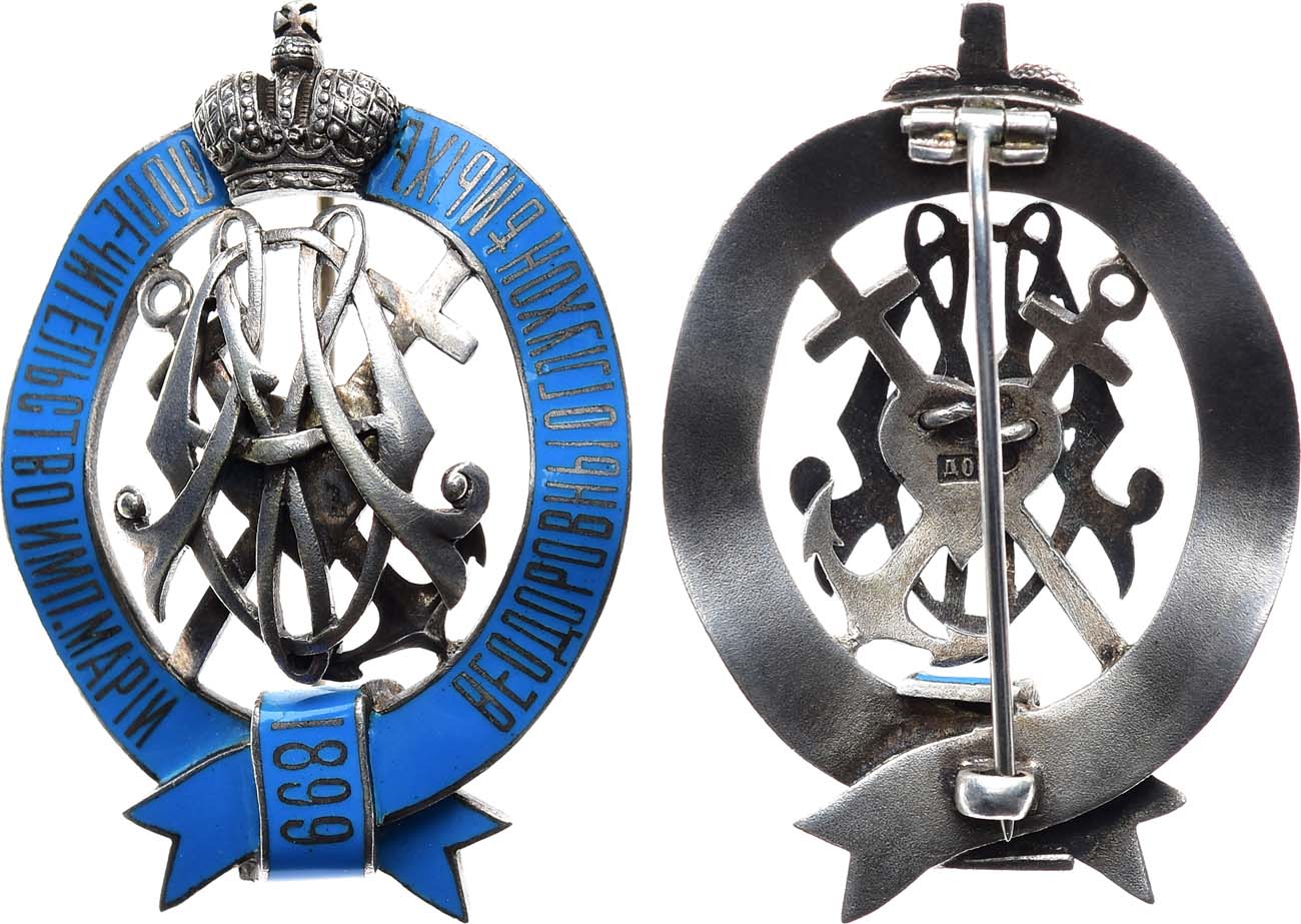 Серебро, эмаль. 22,65г. Размеры: 52х35 мм. Знак представляет собой вьющуюся ленту в форме овала, перевязанную в нижней части знака. Лента покрыта непрозрачной голубой эмалью. На ленте помещена легенда "ПОПЕЧИТЕЛЬСТВО ИМП. МАРIИ ѲЕОДОРОВНЫ О ГЛУХОНѢМЫХЪ". На узле ленты помещена дата "1899" - год основания Попечительства и утверждения знака. В центре знака расположен вензель Императрицы Марии Фёдоровны в виде переплетённых литер "М" и "Ѳ", наложенных на Крест, якорь и сердце - символы веры, надежды и любви. Композиция увенчана Императорской короной. Клейма на реверсе знака: 1. Санкт-Петербургского окружного пробирного управления после 1908 года ("альфа", женская голова в кокошнике вправо, "84") в овальном щитке. 2. Знак удостоверения того же управления в круглом щитке (женская голова в кокошнике вправо с точкой под подбородком). 3. Фирменное "ДО" в прямоугольном щитке. Санкт-Петербург, 1908-1917 гг. Фирма "Дмитрий Осипов". С.В. Патрикеев, А.Д. Бойнович № 3.20 б. UNC.
