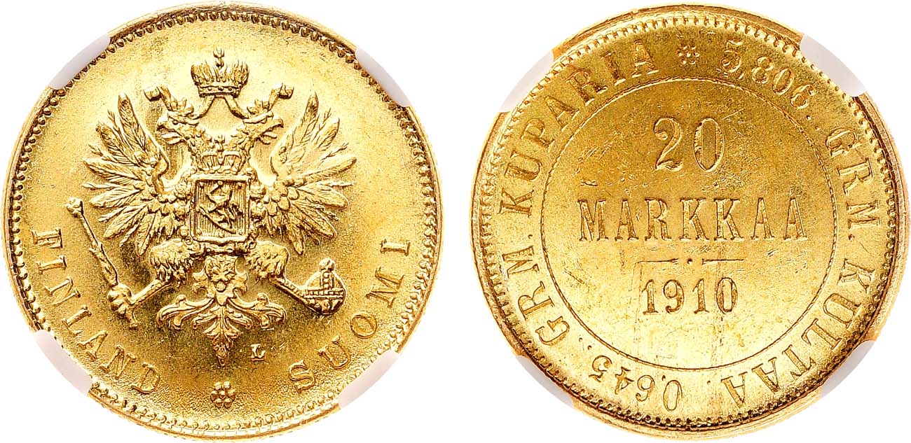 Золото. Для Финляндии. Гельсингфорсский монетный двор. Тираж: 201.000 экз. Уздеников 4801(–). Биткин 387. Казаков 389(R). MS 63.