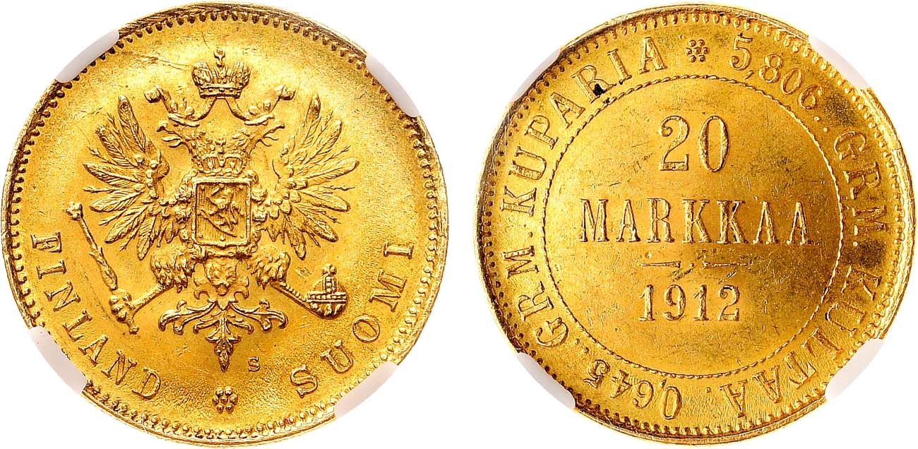 Золото. Для Финляндии. Гельсингфорсский монетный двор. Уздеников 4810(–). Биткин 390. Казаков 432(R). MS 63.