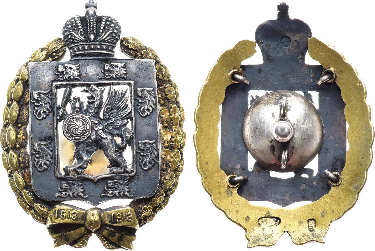 Серебро, оксидирование, золочение. 20,84г. Размеры 44,5х32,4 мм. Российская империя, Санкт-Петербург, фирма "Э. Кортман", после 1913 года. Клейма на знаке: 1. Санкт-Петербургского окружного пробирного управления после 1908 года ("альфа", женская голова в кокошнике вправо, "84") в овальном щитке. 2. Знак удостоверения Санкт-Петербургского окружного пробирного управления после 1908 года в круглом щитке (женская голова в кокошнике вправо, точка под подбородком). 3. Именное клеймо "К.П". Патрикеев, Бойнович 14.3. UNC.